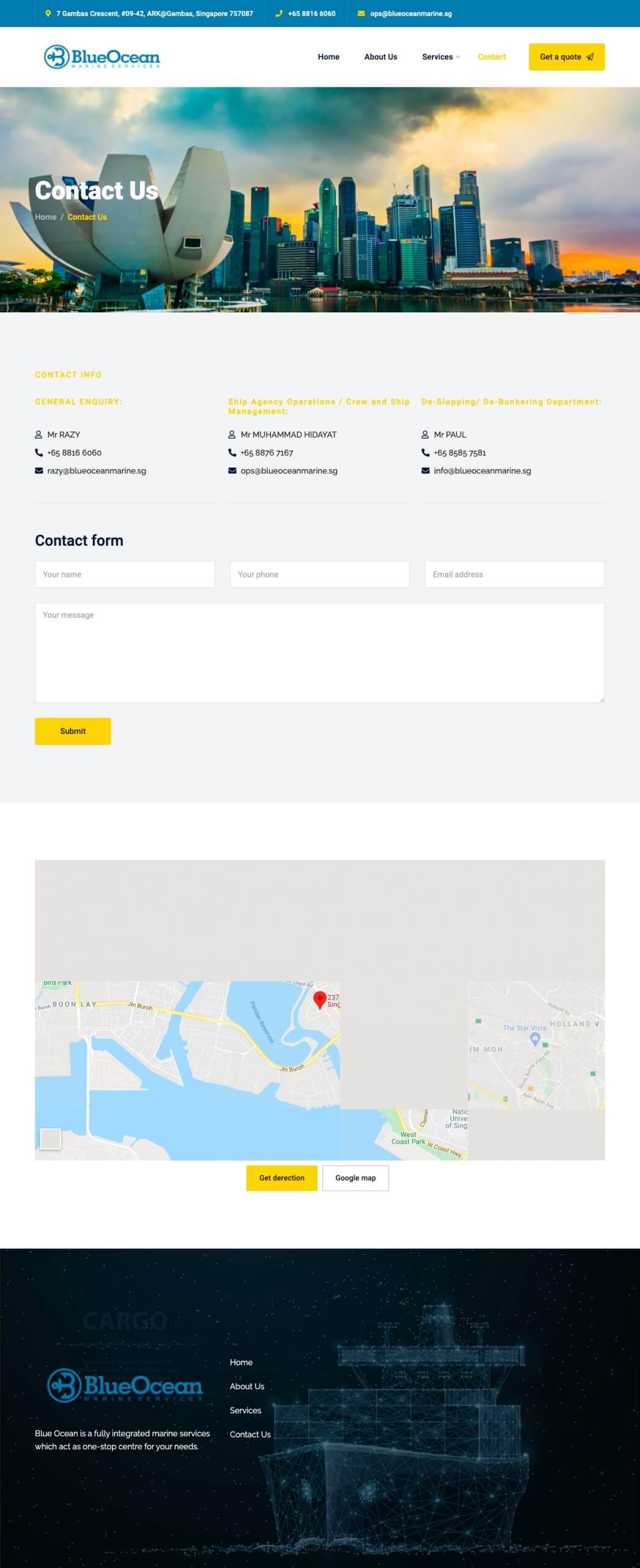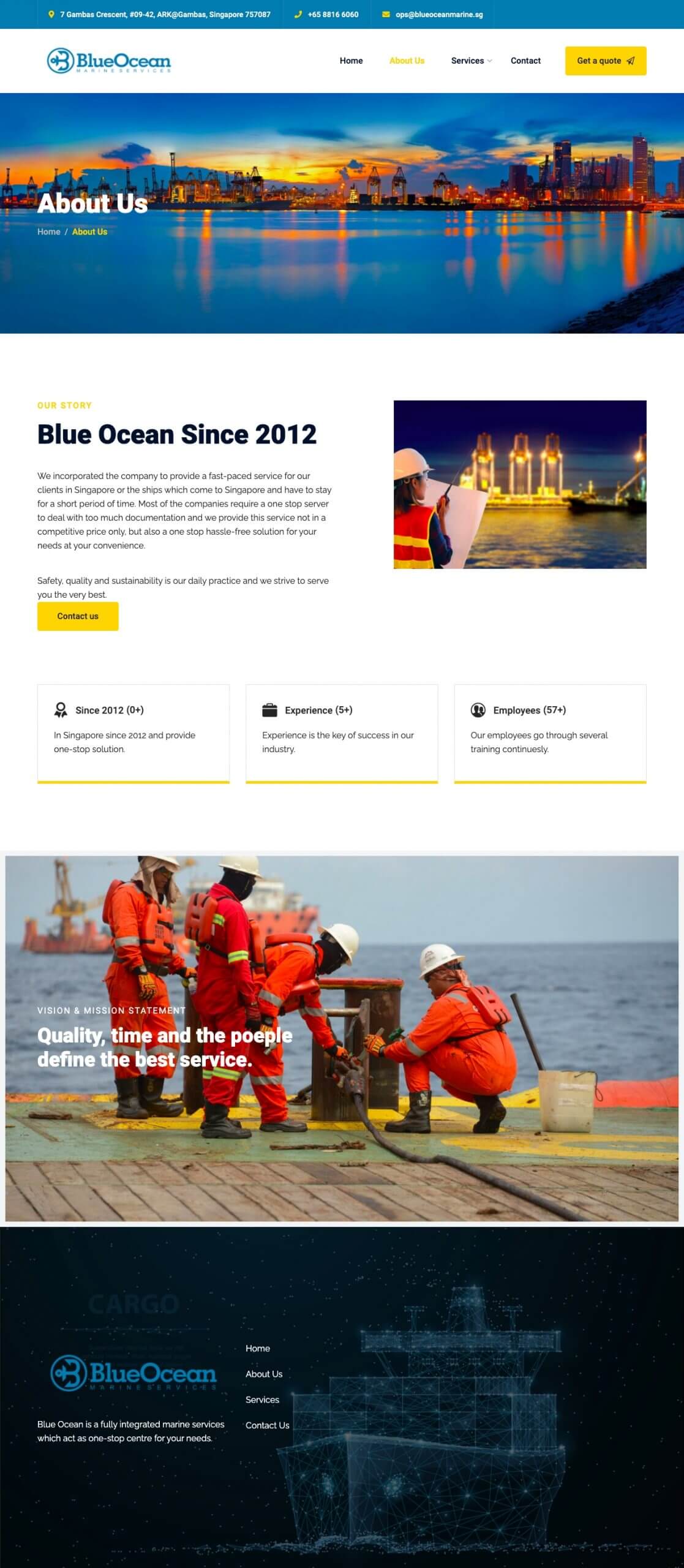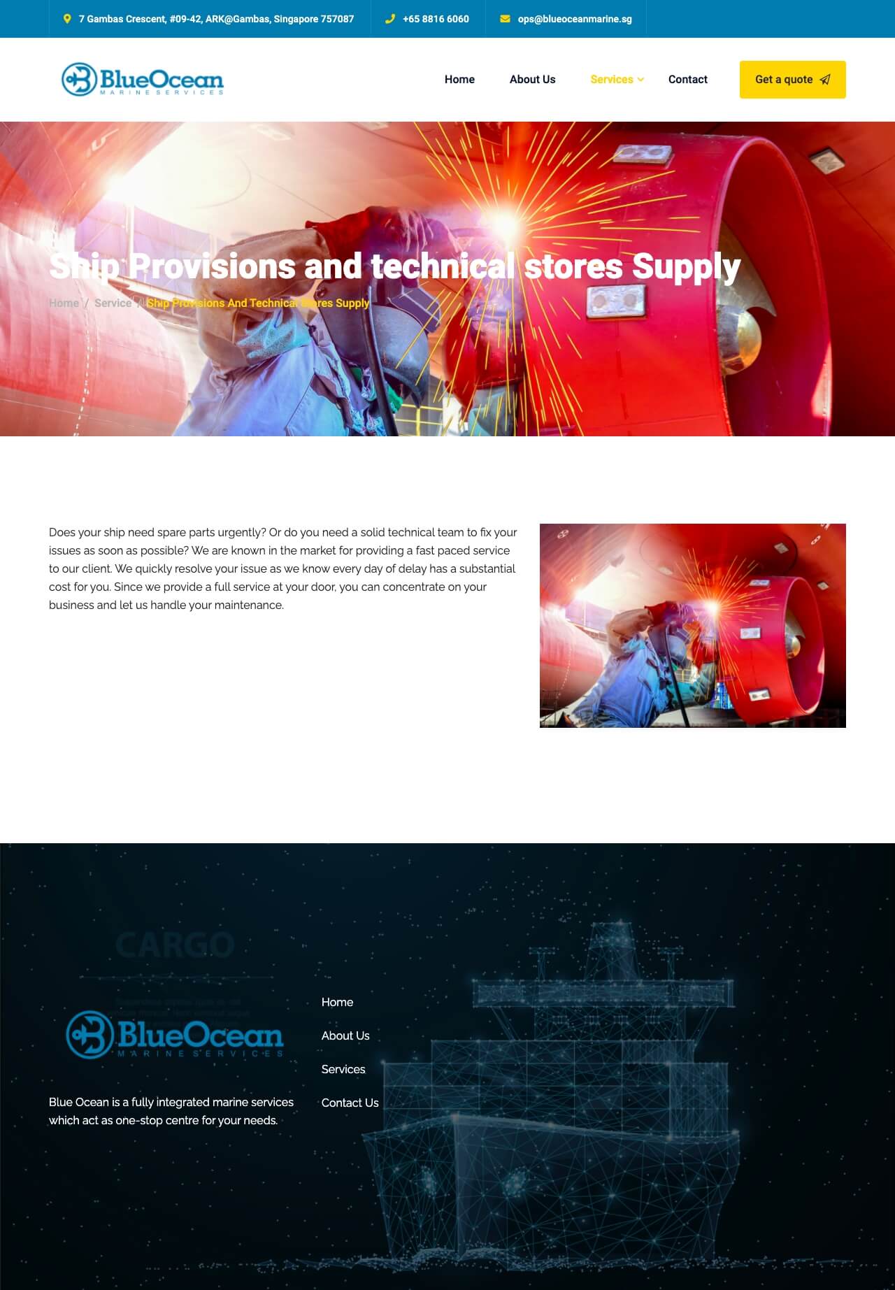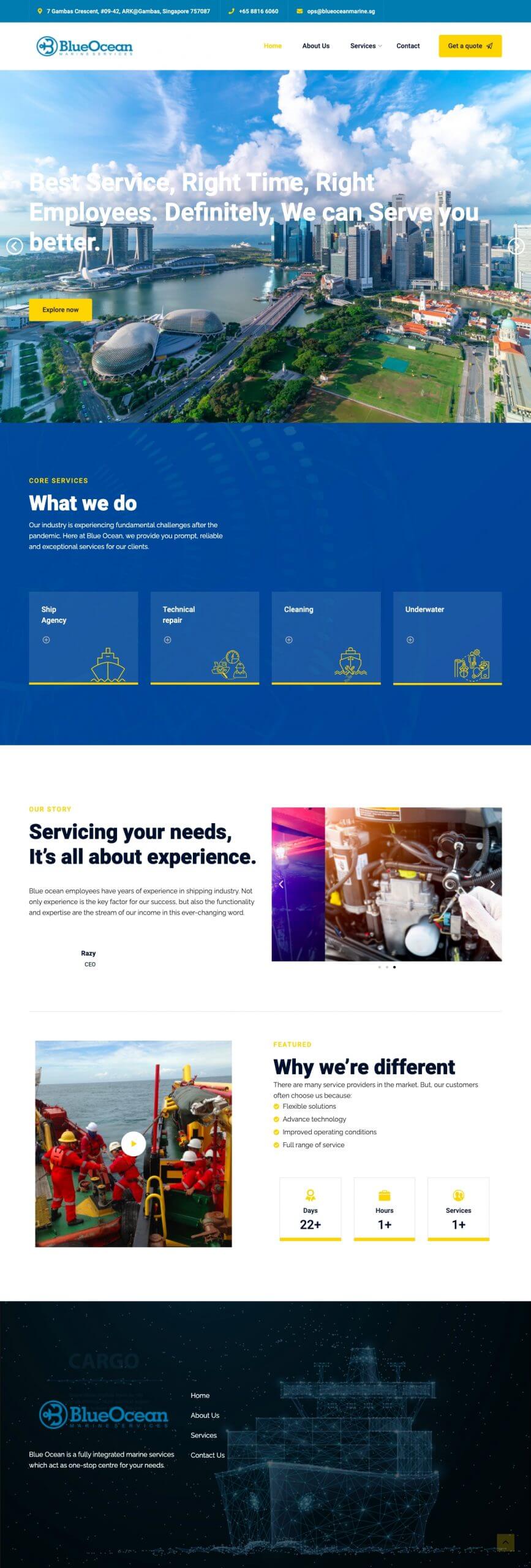 Get to know Blue Ocean, and why you should choose them for your marine services. The call to action is clear, and the contact details are separated in a Contact Us page for customer convenience.
