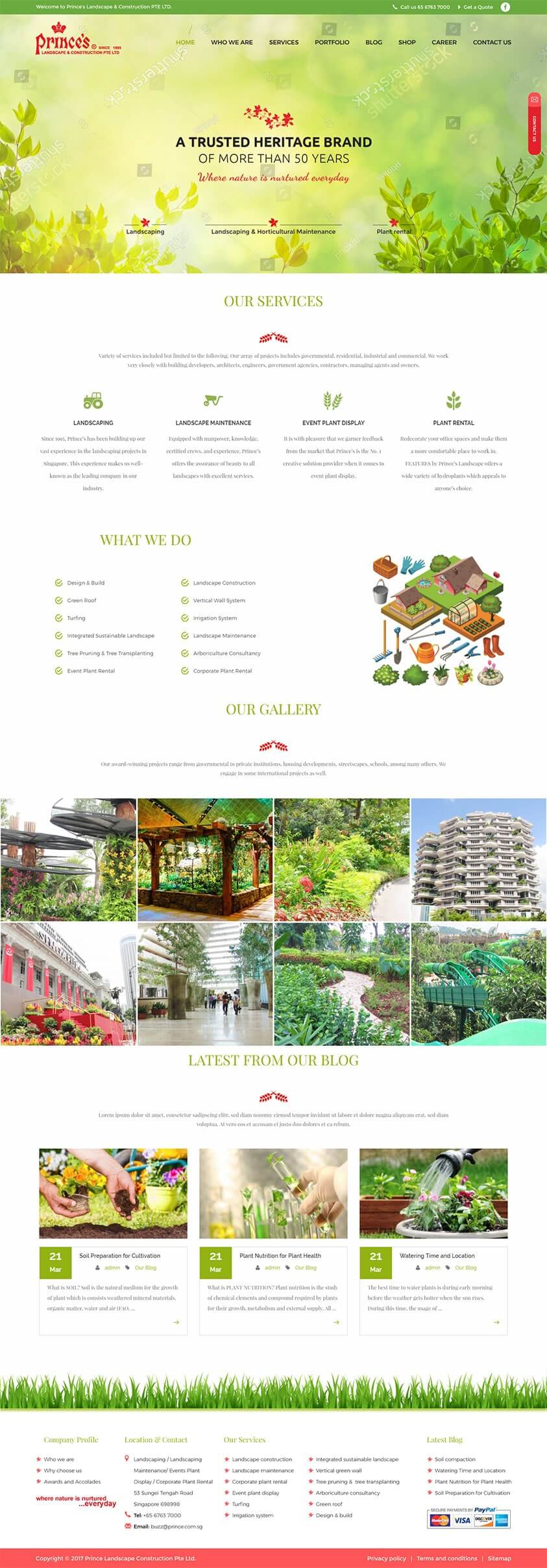 We enumerate their complete services, with pictures and short descriptions. These include landscape construction, maintenance, corporate plant rentals, event plant display, turfing, irrigation systems, sustainable landscape, vertical green wall, tree pruning, cutting and transplanting.